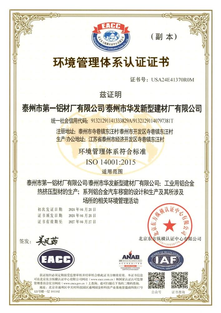Taizhou No. 1 Aluminum Factory Co., Ltd. is located in Taizhou High-tech Development Park, Jiangsu Province, covering an area of 60,000 square meters, with 400 employees and 50 engineering and technical personnel. The main products are industrial aluminum alloy profiles and aluminum alloy automobile side windows. With an annual output of 4,000 tons of aluminum and 50,000 sets of side windows.