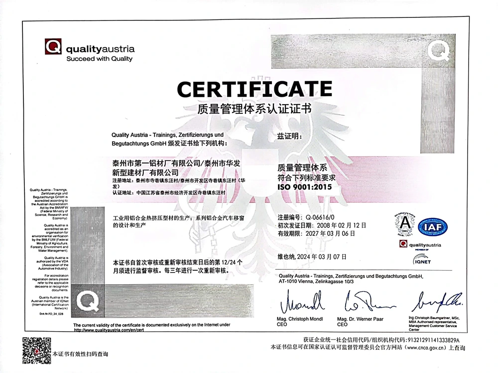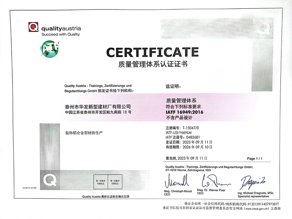 通过了 ISO9001:2015 质量管理体系认证以及 Quality Austria 国际认证公司颁发的 LATF16949:2016 质量体系认证。